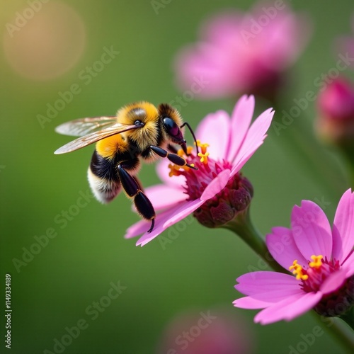 Small yellow and black striped bumblebee hovering around a wildflower, blossoms, pollen