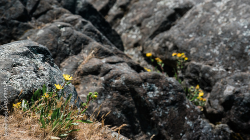 small yellow flowers grow out of lichen covered rocks on the pacific coastline