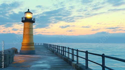 Small yellow lighthouse at the end of the pier against the blue sea and pastel sky