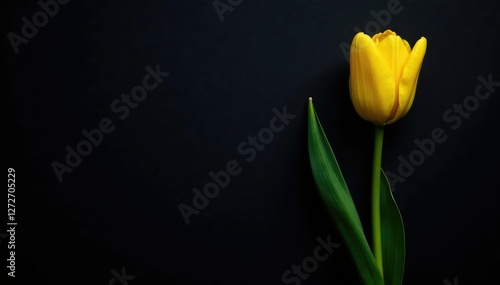 Small yellow tulip bud with green stem on a somber black canvas, art, yellow, bud