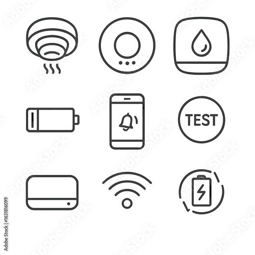 Smart Alarm Icon Set. Line style icons of Smart Alarm Integration: smart smoke detector, smart CO detector, water leak alarm,