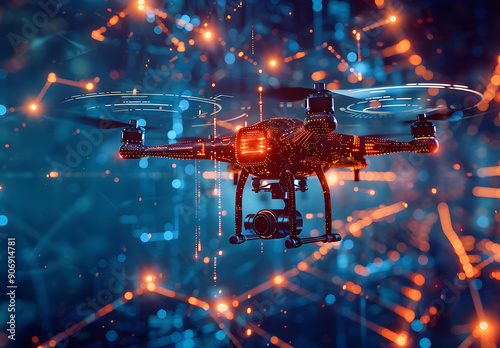 smart blue digital hologram drone with a camera, AI in aerial surveillance systems, autonomous flight navigation, remote sensing technologies, and disaster response coordination design