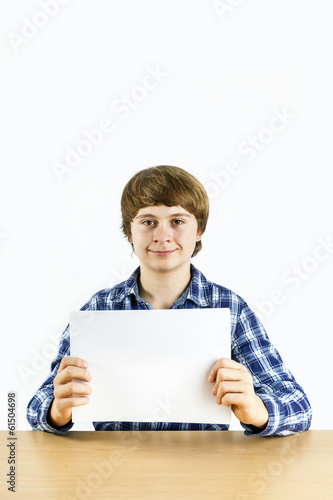 smart boy holding an empty white poster