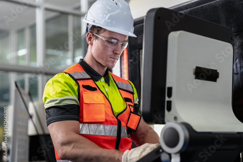 Smart Caucasian engineer work setup AI automated in robotics electronics engineering laboratory. Technician inspector maintenance repair check robot CNC machine in artificial intelligent laboratory.