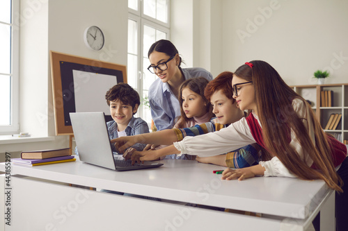 Smart children pupil pointing at laptop screen while discussing media material or online project with teacher on lesson in school classroom. Curious diverse elementary students and female educator