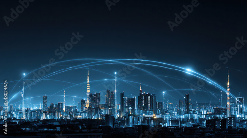 Smart city at night illuminated with glowing band lights, futuristic digital transformation vibe, 5G communication towers and fiber optic lines across skyline
