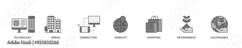 Smart city icon infographic illustration concept with icon of technology, urban, connection, mobility, shopping, environment and sustainable icon live stroke and easy to edit