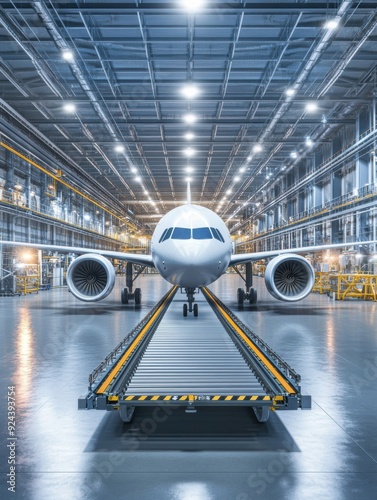 Smart conveyor belts efficiently transport aircraft engines, representing the pinnacle of industry automation and supply chain efficiency.