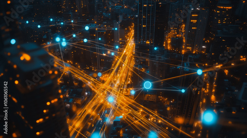 Smart digital city with connection cyber security network reciprocity over the cityscape . future smart wireless digital city and social media networking systems that connects people within the city