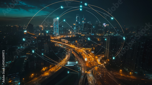Smart digital city with connection cyber security network reciprocity over the cityscape . future smart wireless digital city and social media networking systems that connects people within the city