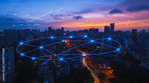 Smart digital city with connection Innovation network reciprocity over the sunset cityscape Concept of future wireless digital city and social media networking systems that connects business people