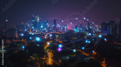 Smart digital Innovation city with connection network reciprocity over the cityscape. of future smart wireless city and social media networking systems that connects business people with in city