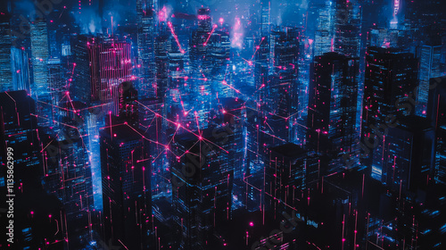 Smart digital Innovation city with connection network reciprocity over the cityscape. of future smart wireless digital city and social media networking systems that connects people with in city