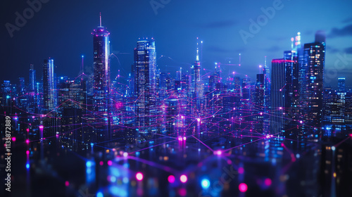 Smart digital Innovation city with connection network reciprocity over the cityscape. of future smart wireless digital city and social media networking systems that connects people with in city
