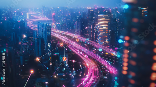 Smart digital Innovation city with connection network reciprocity over the cityscape. of future smart wireless digital city and social media networking systems that connects people with in city