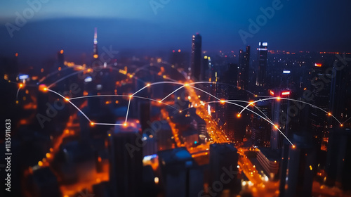 Smart digital Innovation city with connection network reciprocity over the cityscape. of future smart wireless digital city and social media networking systems that connects people with in city