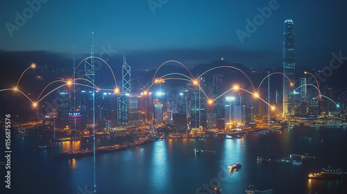 Smart digital Innovation city with connection network reciprocity over the cityscape. of future smart wireless digital city and social media networking systems that connects people with in city