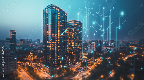 Smart digital Innovation city with connection network reciprocity over the cityscape. of future smart wireless digital city and social media networking systems that connects people with in city