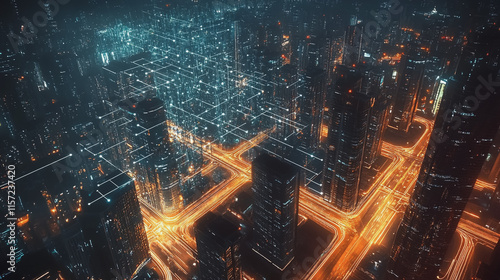 Smart digital Innovation city with connection network reciprocity over the cityscape. of future smart wireless digital city and social media networking systems that connects people with in city