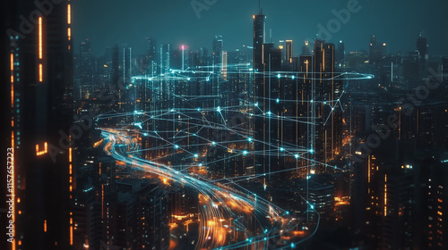Smart digital Innovation city with connection network reciprocity over the cityscape. of future smart wireless digital city and social media networking systems that connects people with in city
