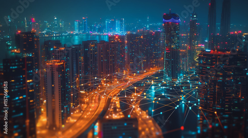 Smart digital Innovation city with connection network reciprocity over the cityscape. of future smart wireless digital city and social media networking systems that connects people with in city