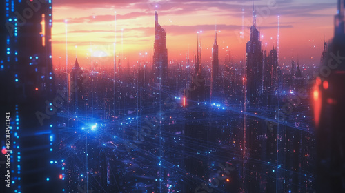 Smart digital Innovation city with connection network reciprocity over the cityscape. of future smart wireless digital city and social media networking systems that connects people with in city