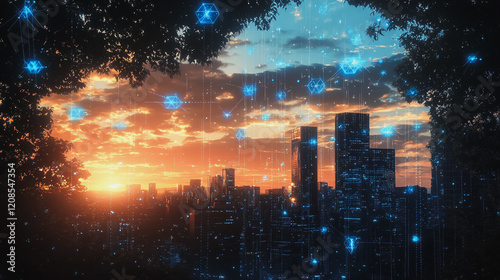 Smart digital Innovation city with connection network reciprocity over the cityscape. of future smart wireless digital city and social media networking systems that connects people with in city