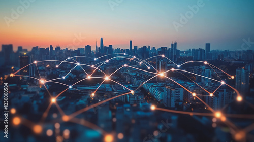 Smart digital Innovation city with connection network reciprocity over the cityscape. of future smart wireless digital city and social media networking systems that connects people with in city