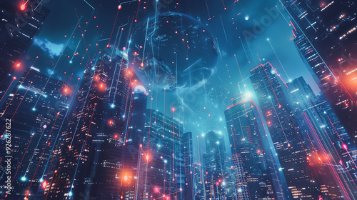 Smart digital Innovation city with connection network reciprocity over the cityscape. of future smart wireless digital city and social media networking systems that connects people with in city