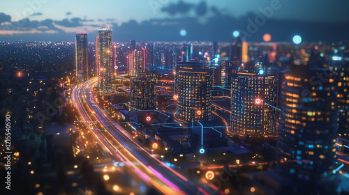 Smart digital Innovation city with connection network reciprocity over the twilight cityscape. of future smart wireless digital city and social media networking systems that connects people with city