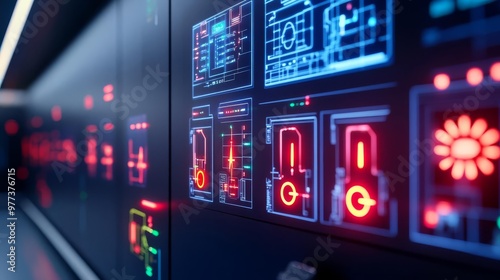 Smart grid management software, holographic power flow, neon energy indicators, futuristic utility control