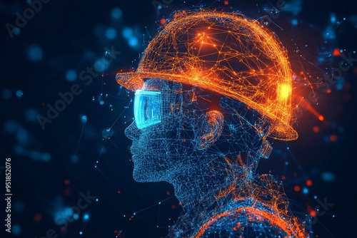Smart helmets in construction, workers connected digitally, safety tech. Generative AI