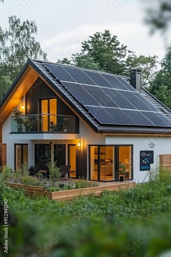 Smart Home Concept with IoT Integration Overlay, Showcasing Solar Panels on the Roof and Green Energy Solutions. Visualizing the Convergence of Sustainable Technology and Intelligent Home Automation.