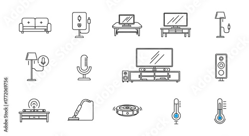 smart home devices line art icons depicting smart home automation controlling appliances promoting modern living and technology integration.