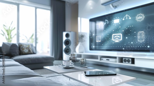 Smart Home Entertainment System with Modern Design - This image showcases a modern living room with a large TV screen displaying smart home icons, symbolizing connectivity, automation, entertainment,
