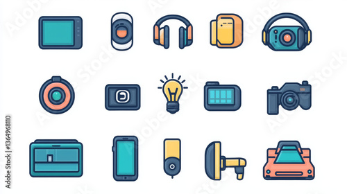 Smart home, internet of things technology outline icons. Vector doodle symbols of mobile phone, wireless watch, headphones, printer, remote control of light, car, camera