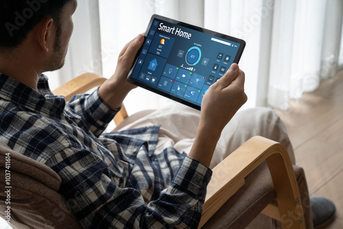 Smart home technology, centric remote control system with digital dashboard for air conditioning, safety security network or house automation. App software, ui panel programming IOT monitor snugly