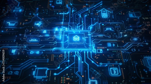 Smart home technology concept with centralized control system. Close-up shot of digital circuit board with glowing house icon. Design for tech innovation presentation