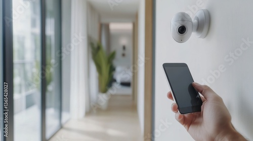 Smart home technology monitoring security cameras with smartphone in a modern apartment indoor setting contemporary view safety concept