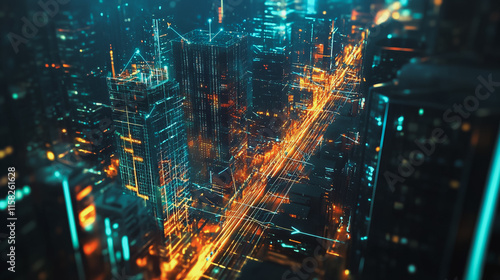Smart Innovation city with connection cyber security network reciprocity over the night cityscape future wireless digital city and social media networking systems that connects people in the city