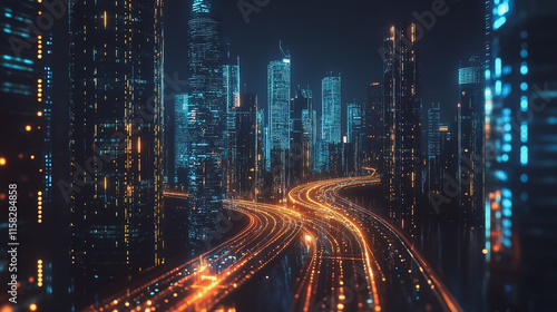 Smart Innovation city with connection cyber security network reciprocity over the night cityscape future wireless digital city and social media networking systems that connects people in the city