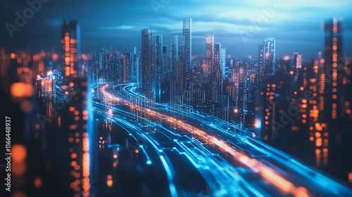 Smart Innovation city with connection cyber security network reciprocity over the sunset cityscape future wireless digital city and social media networking systems that connects people in the city