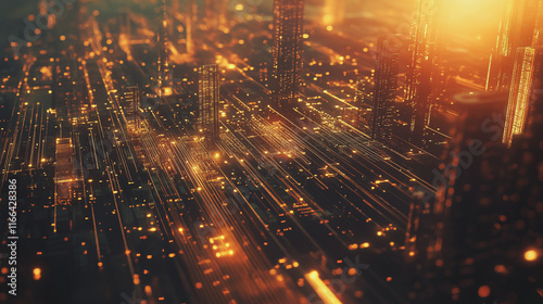 Smart Innovation city with connection cyber security network reciprocity over the sunset cityscape future wireless digital city and social media networking systems that connects people in the city