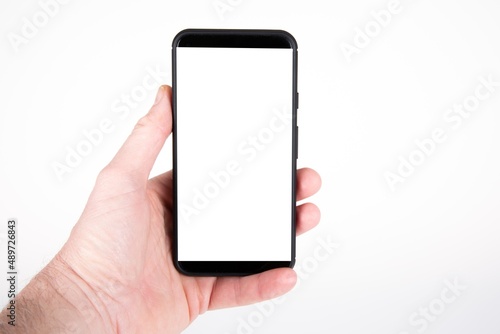Smart phone blank white screen mockup model black in male hand with empty face copy space