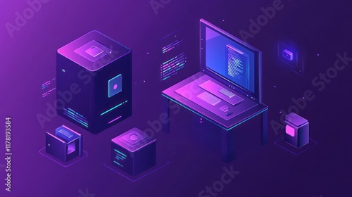 Smart production system with automated robots assembling stock, digital interfaces for process monitoring, sleek machinery