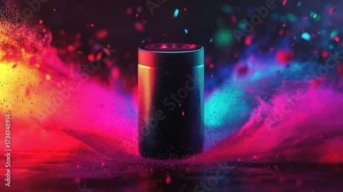 Smart speaker creating vibrant sound waves with neon colors