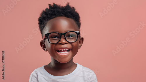 Smart young boy with a neat haircut and bold black glasses, against a soft pink background
