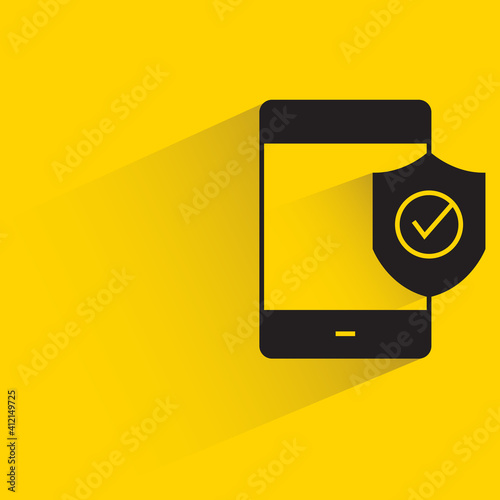 smartphone and shield and check mark for mobile security concept shadow on yellow background