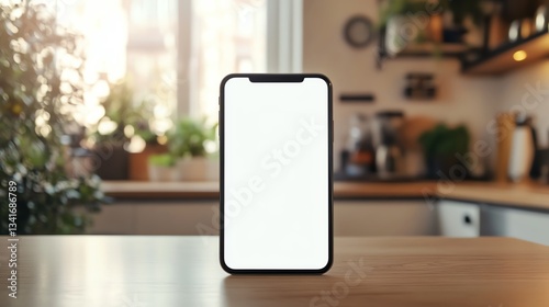 Smartphone blank white screen mockup on kitchen table in cozy home setting.