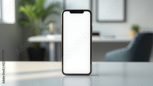 Smartphone Front View Mockup, Photorealistic smartphone front view on a desk with a vibrant screen and blank app interface.